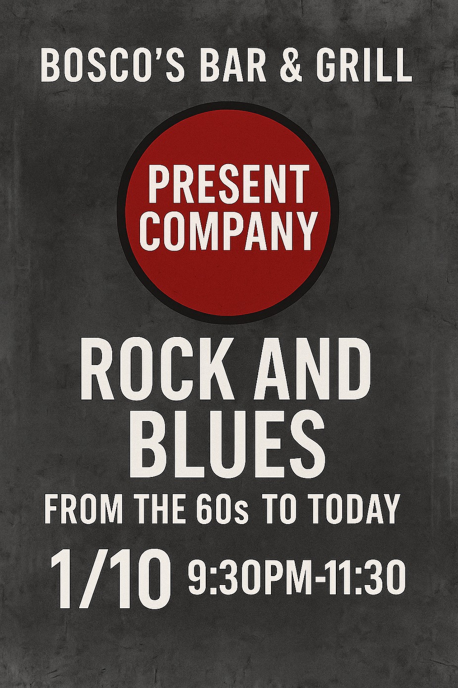 PRESENT COMPANY brings the best of 70s–90s rock, jams, and alt-rock hits to the stage. With powerful vocals, guitars, and a driving rhythm, and a great horn section delivering a live show that’s pure energy—sing-along classics, crowd-moving jams, and rock the way it’s meant to be played.