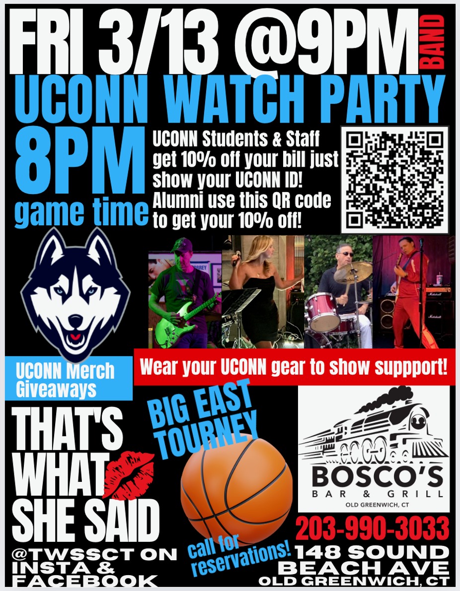 UConn watch party!! That’s What She Said will be rockin’ Boscos!!