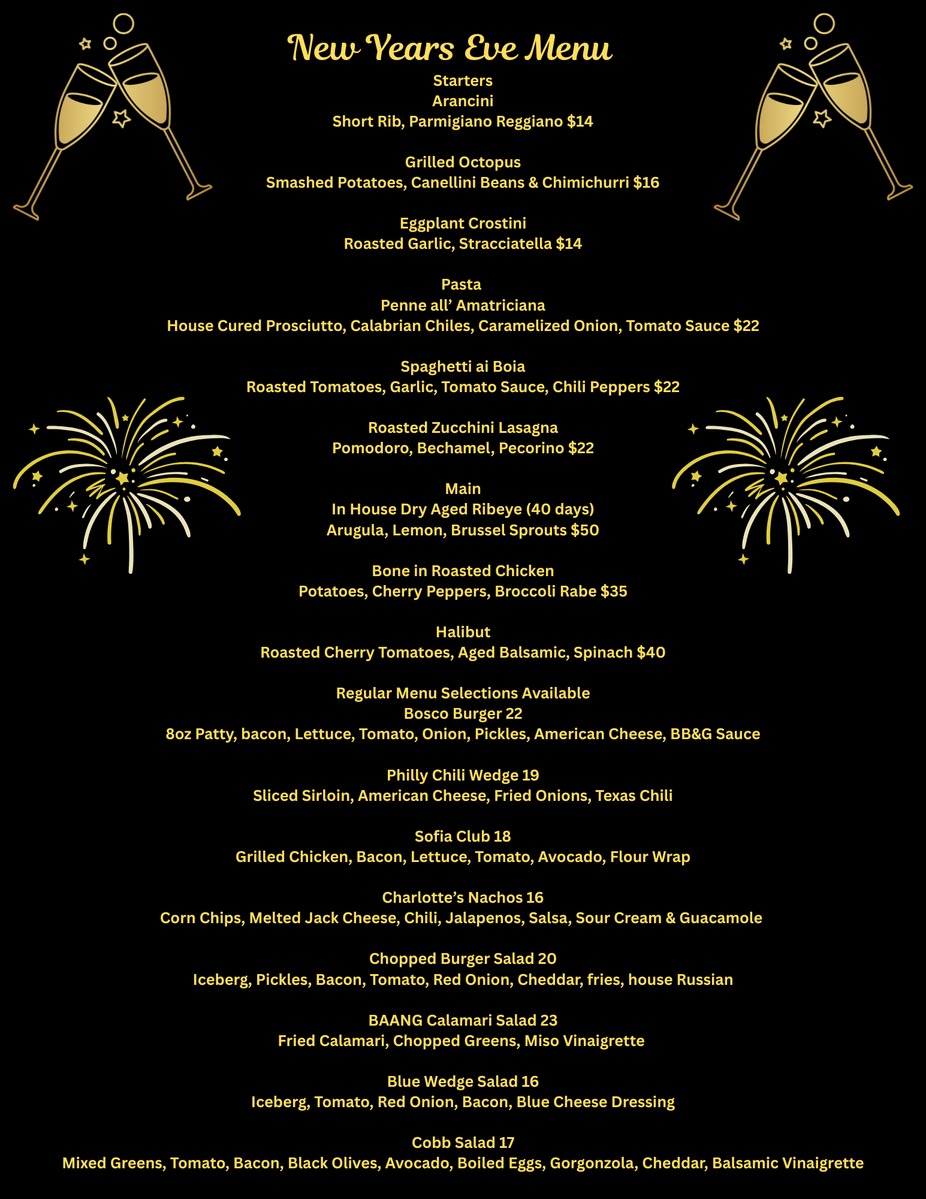 Come ring in the new year at Bosco's! Special menu items form Chef Anthony that can be bundled or ordered a la carte. We suggest making a reservation asap, spots are filling up!! Drinks specials, all the big games, friendly faces and a new year!!